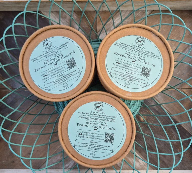 Raw Nigerian Dwarf Goat Milk, Raw Goat Milk Chèvre (Raw Nigerian Dwarf Goat Milk, Mesophilic Aromatic Culture, Salt), Pasture Raised Eggs, Organic Cane Sugar, Homemade Vanilla Extract